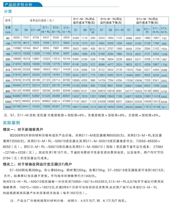 节电节能:较现行“GB/T 6451—2008油浸式电力变压器技术参数和要求”空载损耗平均降低50%,空载电流平均降低70%;